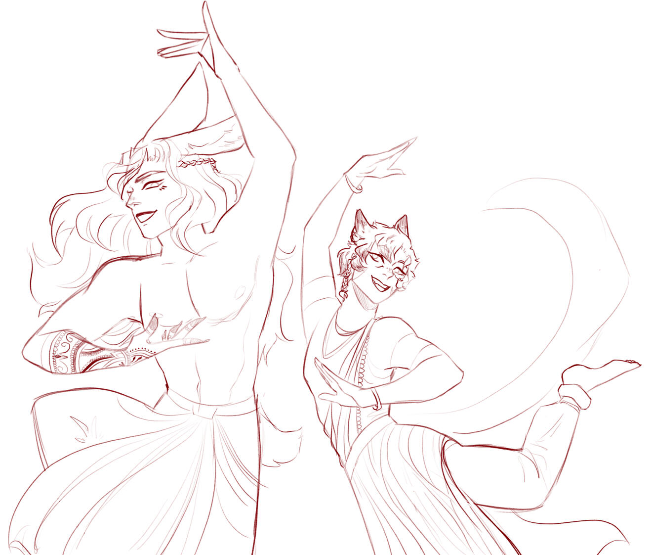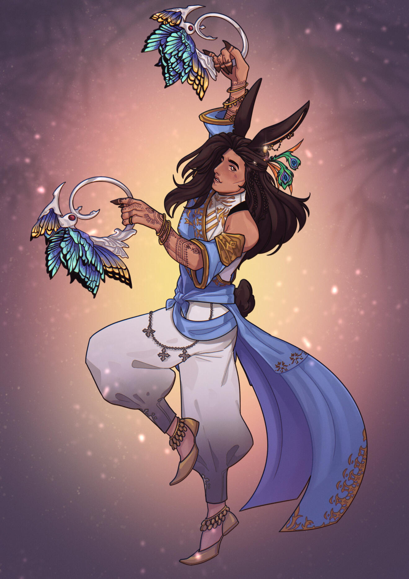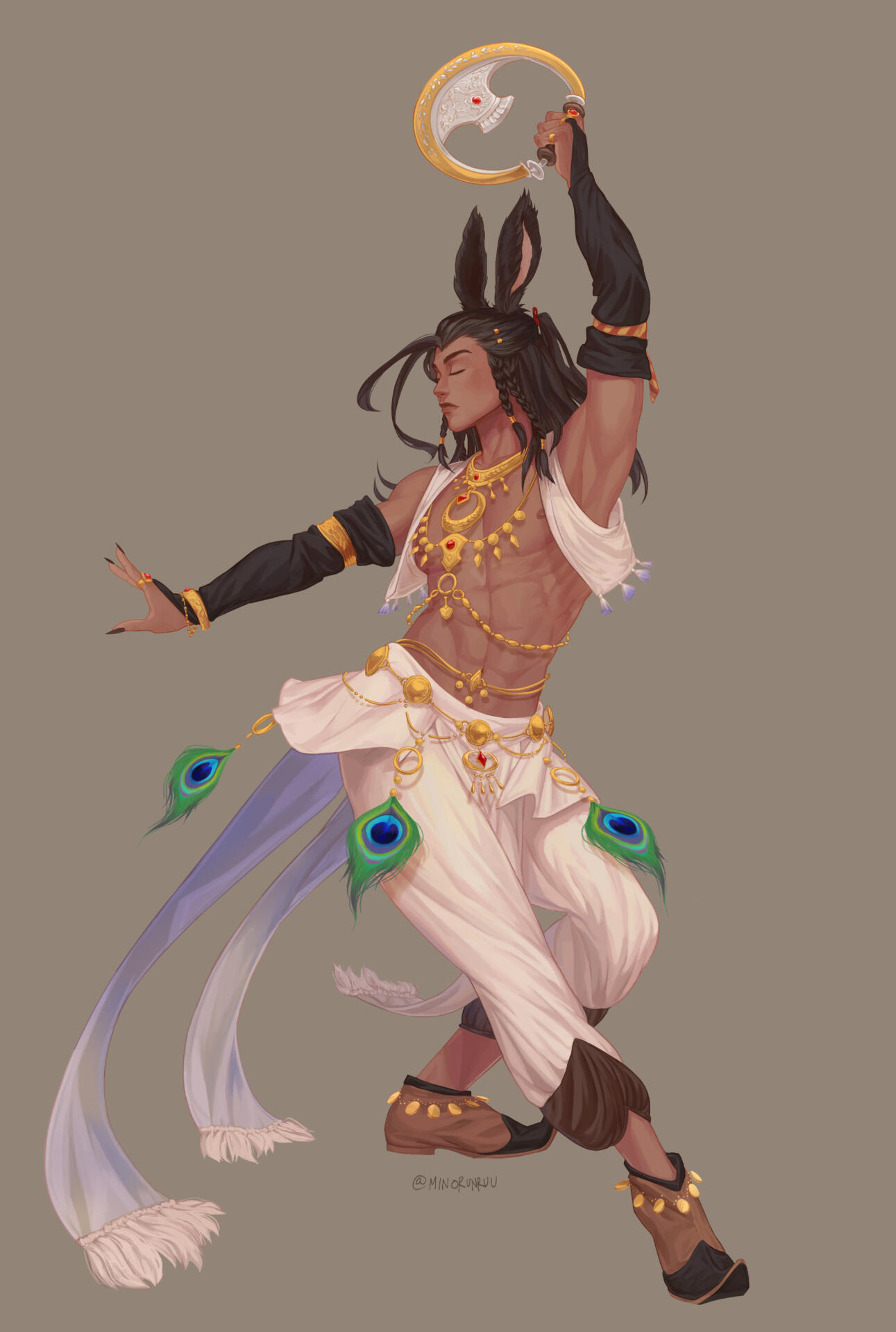 Expressive Dance: When he dances, he uses a lot of facial and hand gestures. At times, he may use chakram blades, throwing knives, or swords as props in his dances. His costumes and headdresses are made of the finest Thavnairian fabrics and materials, as his large family all work in textiles, goldsmithing, and more. His accompanying jewelry pieces are usually very ornate with bronze, gold, and other metals and precious stones that shimmy, chime, and shimmer when he moves.